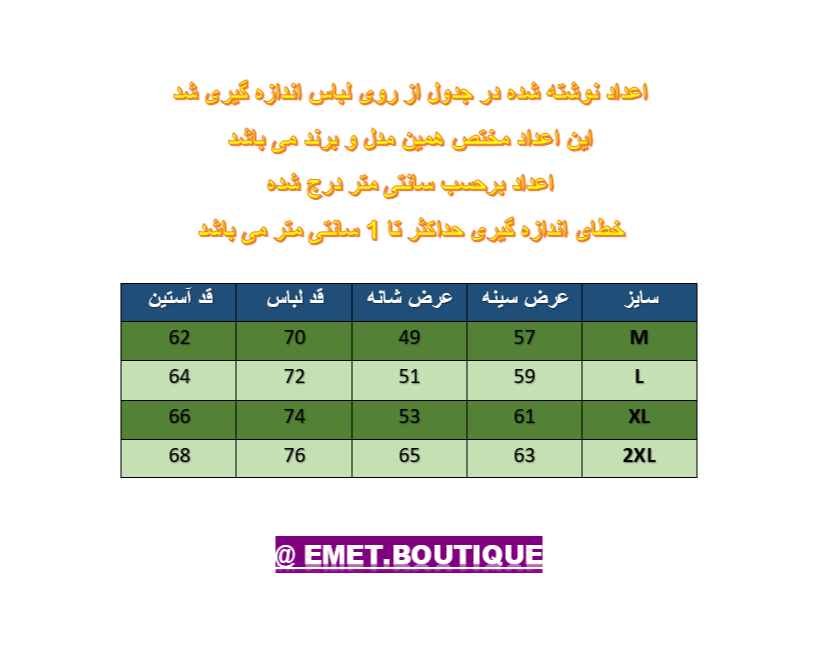 پيراهن مردانه آستين بلند .قواره بزرگ يا همان قواره جعبه اي . داراي 1 جيب . فرم يقه معمولي و کراوات خور . داخل يقه و مچ ها خرج کار (لايه چسب و نوک يقه) دارد که از خميدگي و شکستگي و چروک شدکي يقه جلوگيري ميکند . جنس پارچه از تترون يزد است که هيچگونه آبرفت يا رنگ رفت ندارد . اين طرح پارچه در 10 رنگ و 4 سايز M / L / XL / 2XL موجود ميباشد .