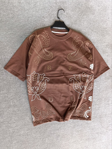 تیشرت قهوه ای پارچه ماکان قواره باکسی مدل بته جقه کد TSH0029
